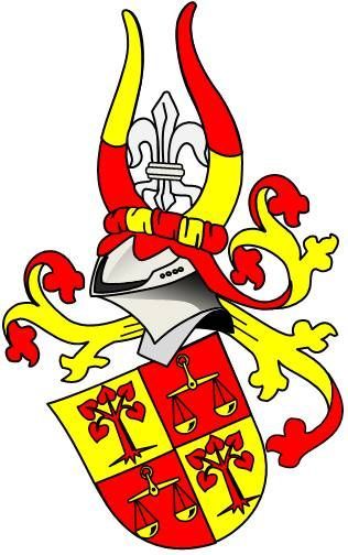 Auf dem rot -golden bewulsteten Helm mit rot-goldenen Decken eine silberne Lilie zwischen zwei golden-rot übereck geteilten Büffelhörnern.